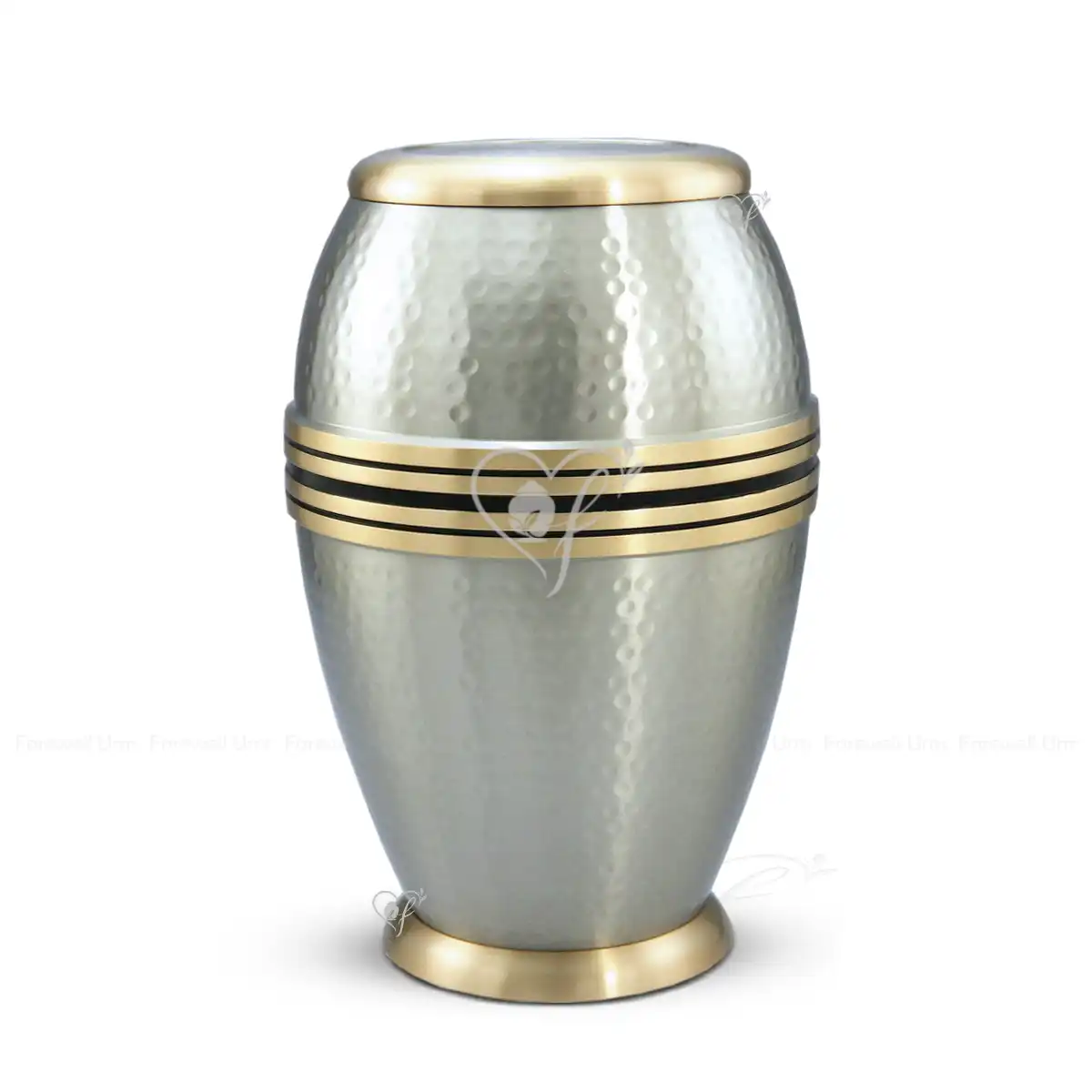 The Aurelian Hammered urn provides a sophisticated and artisanal tribute for a beloved adult. We meticulously craft each vessel from high-quality solid brass to ensure a permanent and sturdy memorial. This 10-inch urn features a modern, barrel-style silhouette with a unique round hammered surface. Consequently, it serves as a dignified resting place that radiates both strength and elegance. Furthermore, the sleek Brushed Pewter body is beautifully accented by Brushed Gold trim for a refined, matte finish.
