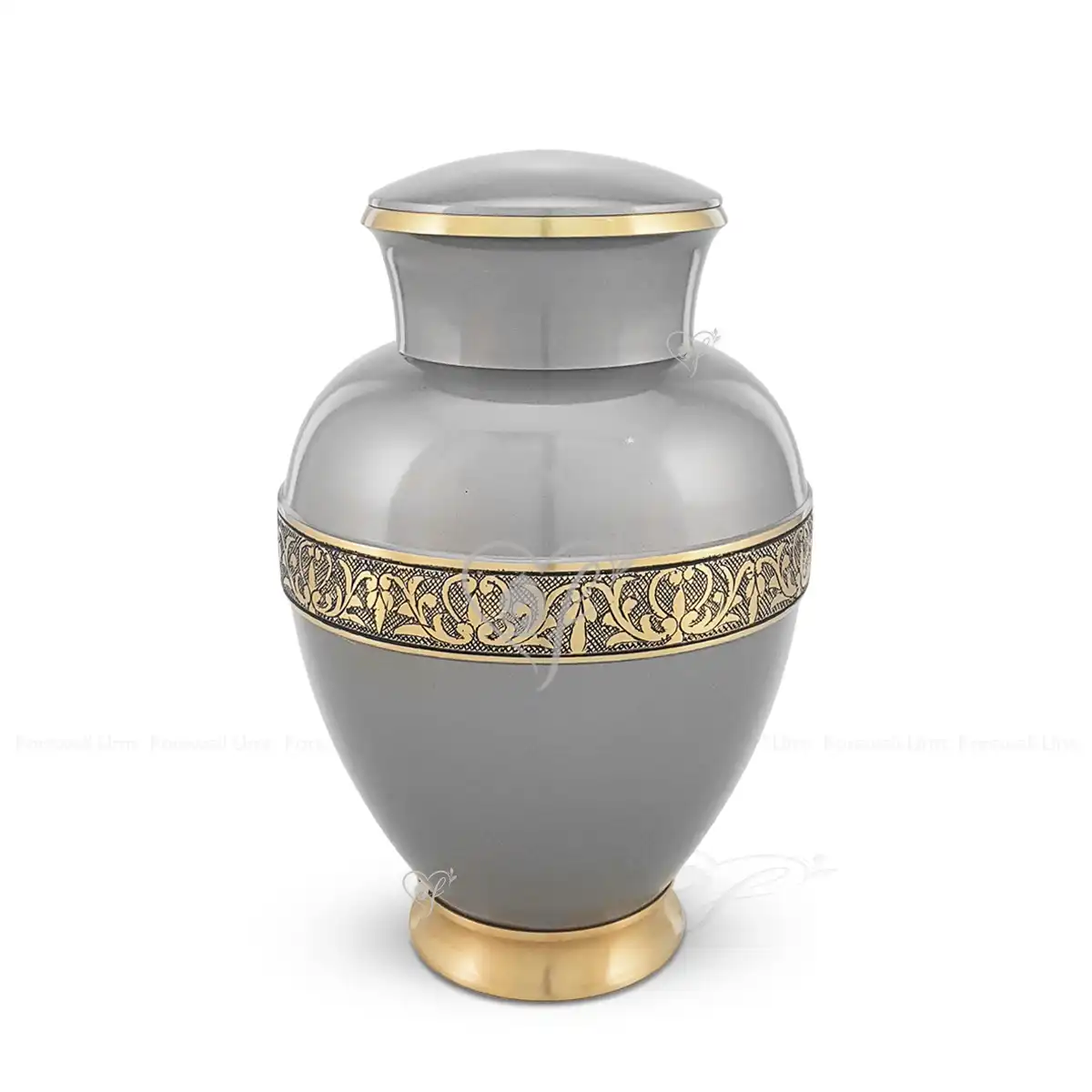 The Aurelian urn provides a sophisticated and timeless tribute for a loved one. We meticulously craft each vessel from high-quality brass to ensure a permanent memorial. This 10-inch urn features a sleek metallic grey finish that radiates peace and modern elegance. Consequently, it serves as a dignified resting place that fits beautifully in any home. Furthermore, a stunning hand-engraved floral band with brushed brass accents encircles the middle for a refined contrast.