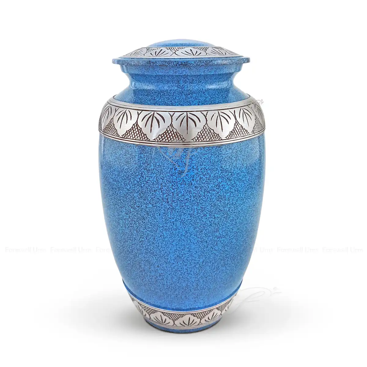 The Azure Arbor is a stately and serene tribute, designed to honor a life defined by peace and natural beauty. This 10-inch vessel is meticulously crafted from high-quality aluminum, offering a solid, durable, and permanent memorial. The urn features a sophisticated Blue Marble finish with a fine, stippled texture that provides exceptional visual depth. The design is elegantly framed by broad, hand-engraved silver-tone leaf bands on the lid, shoulder, and base, revealing the bright brushed metal beneath.
