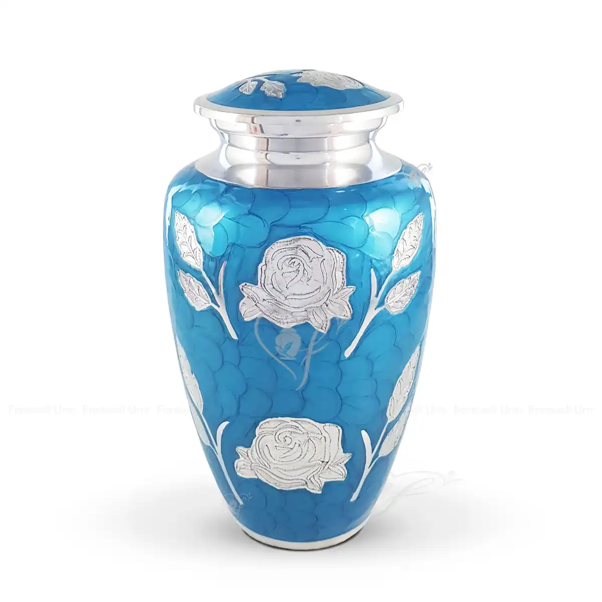 The Azure Bloom is a vibrant and graceful memorial, designed to honor a life defined by beauty and serenity. This 10-inch vessel is meticulously crafted from high-quality aluminum, providing a solid, durable, and permanent construction. The urn features a radiant Sky Blue glossy meena finish, a traditional technique meticulously done by hand to achieve a brilliant, glass-like luster. The body is adorned with a stunning hand-engraved rose design, where the natural aluminum is contrasted in a shiny look against the vivid blue backdrop.