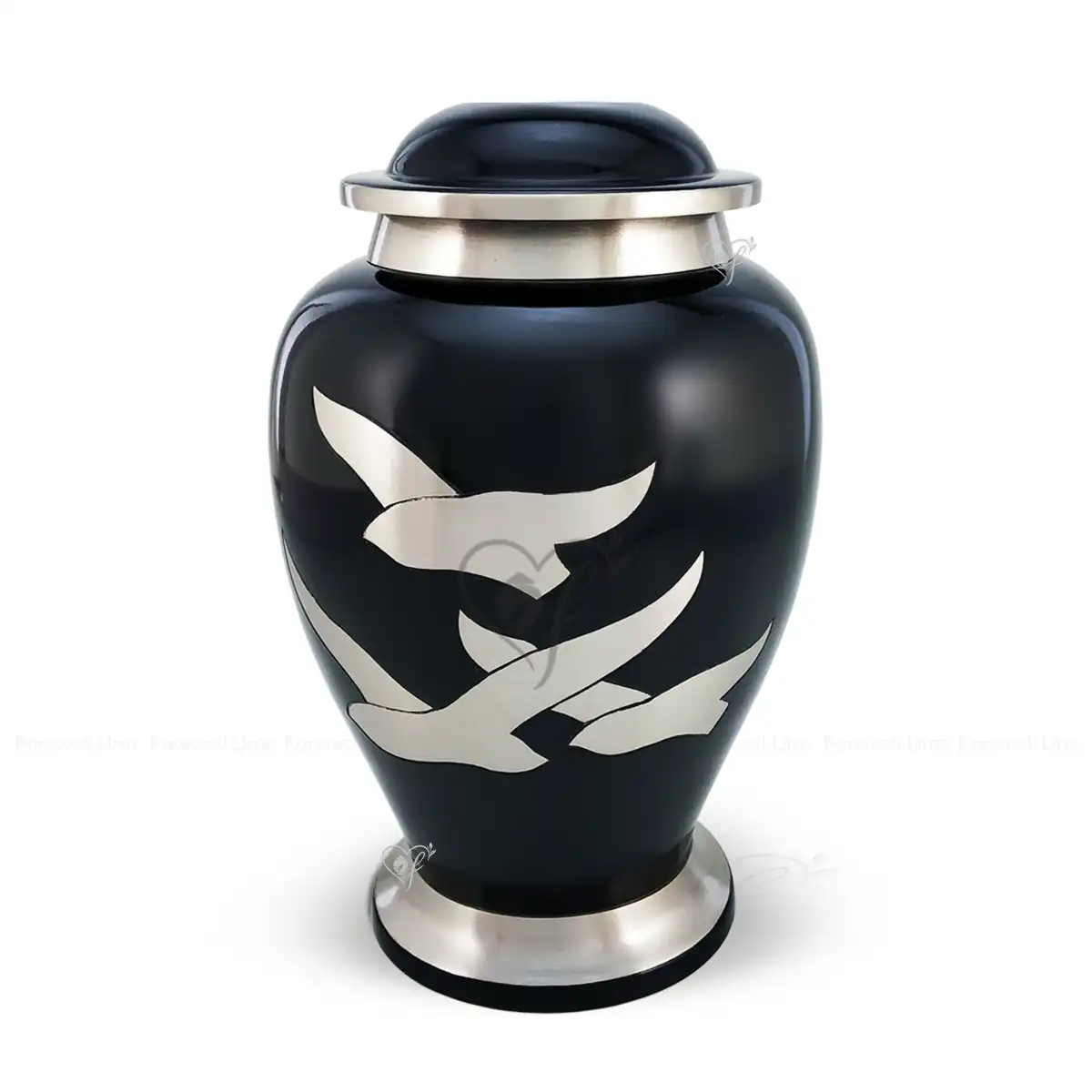 The Eternal Flight urn provides a powerful and peaceful tribute for two souls shared in life. We meticulously craft this oversized memorial from high-quality aluminum to ensure a permanent and sturdy resting place. This urn features a deep Glossy Black finish that radiates dignity and timeless elegance. Consequently, it serves as a beautiful centerpiece for a shared memorial service or home display. Furthermore, the design is highlighted by three soaring birds in a Brushed Aluminum finish to symbolize the journey of the spirit.