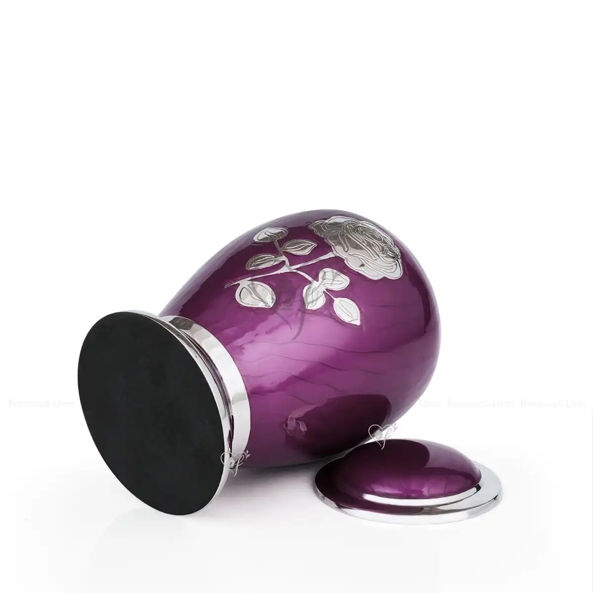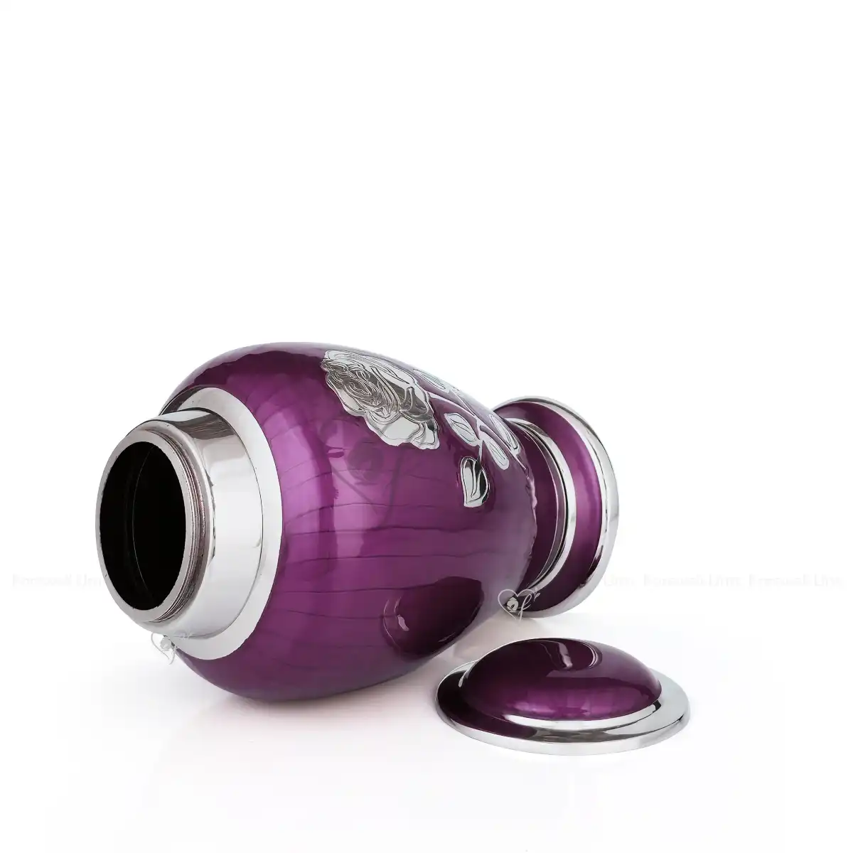 The Eternal Rose adult urn from Farewell Urns is made of solid brass with a vibrant Royal Purple finish. We meticulously craft this memorial with a hand-engraved rose and trim in polished nickel. This durable and solid vessel includes a secure threaded lid to keep your loved one’s remains protected for eternity.