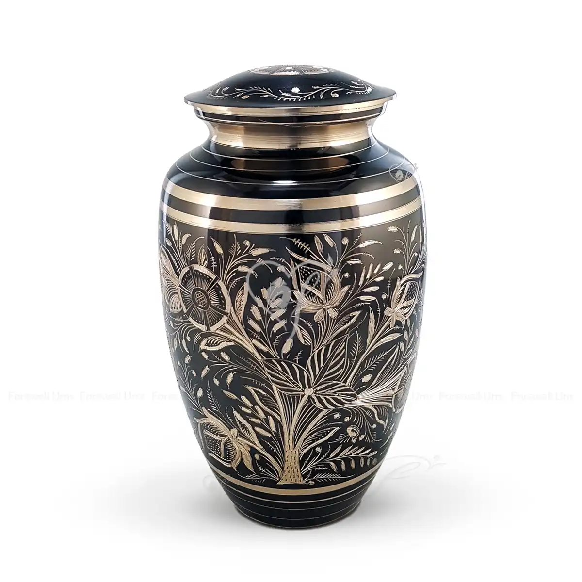The Midnight Meadow is a dignified and timeless tribute, crafted to celebrate a life of grace and enduring beauty. This 10-inch vessel is meticulously forged from premium brass, providing a substantial weight and permanent durability. The urn features a sophisticated Black Steel finish, serving as a bold, dark canvas for a striking hand-finished floral pattern. The polished brass motifs are enhanced with intricate hand-engraving, adding a deep, artisanal texture to the botanical design.