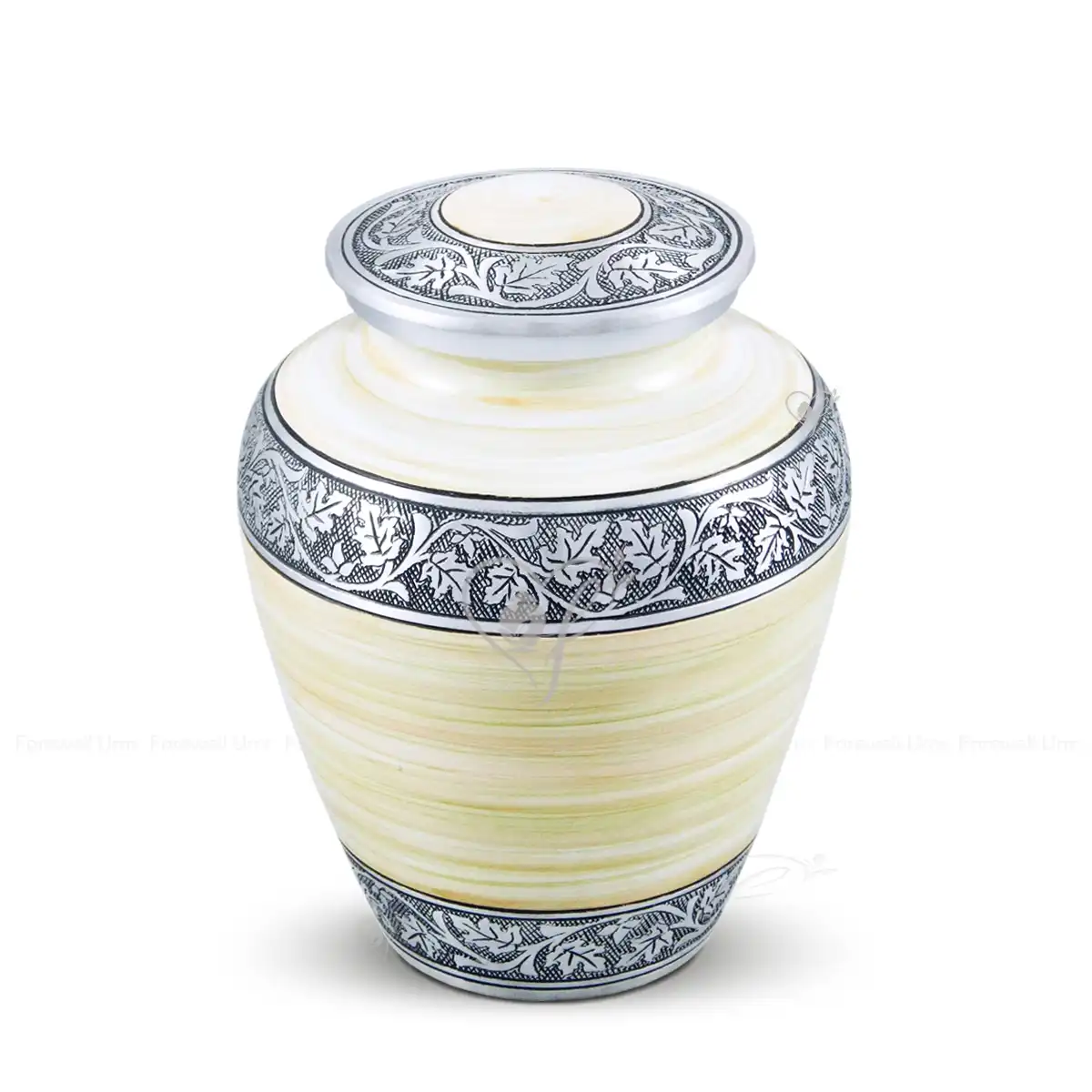 Morning Mist is a 9-inch aluminum cremation urn featuring a modern Elite shape and a soft, spray-painted finish in hues of white and light yellow. Adorned with hand-chiselled silver floral engravings, this durable yet lightweight vessel serves as a peaceful and radiant tribute, capturing the tranquility of a new dawn.