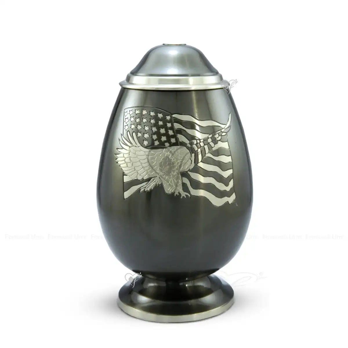 The Patriot Guard urn offers a powerful and dignified tribute for a beloved veteran or patriot. We meticulously craft each vessel from high-quality solid brass to provide a permanent and sturdy memorial. This 10-inch urn features an elegant, egg-shaped silhouette with a sophisticated Brushed Slate finish. Consequently, it serves as a solemn resting place that radiates strength and honor. Furthermore, the design is highlighted by a stunning hand-engraved Eagle and American Flag motif in a brilliant Pewter finish.