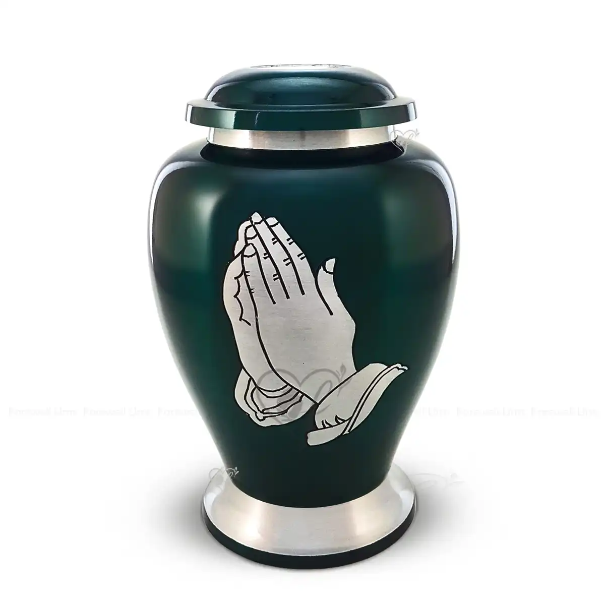 The Sacred Devotion urn offers a peaceful and reverent tribute for two souls shared in life. We meticulously craft this oversized memorial from high-quality aluminum to ensure a permanent and sturdy resting place. This urn features a rich Deep Glossy Green finish that radiates tranquility and timeless dignity. Consequently, it serves as a meaningful centerpiece for a shared memorial service or home display. Furthermore, the design is highlighted by a beautifully hand-engraved Praying Hands motif in a Brushed Aluminum finish to symbolize faith and eternal peace.